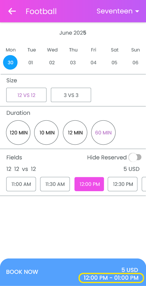 Great news for field reservations! Once you select your time slot, you'll now see the exact reservation time clearly displayed on the 'Book Now' button as you proceed to checkout.