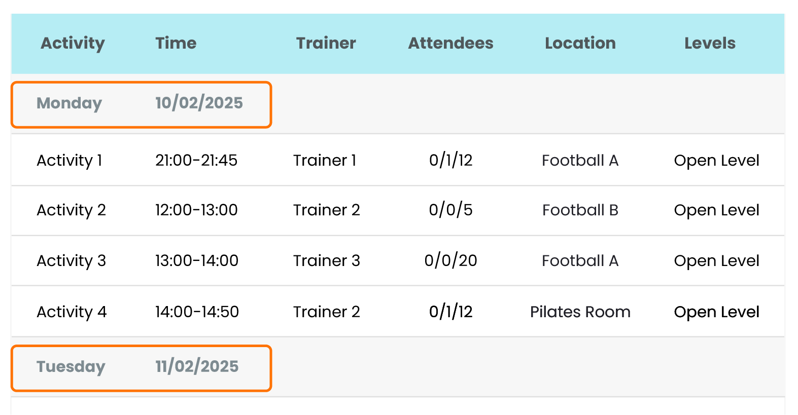 ● Day per Trainers View: View all trainers together along with their assigned sessions for the selected day, providing a comprehensive schedule overview.