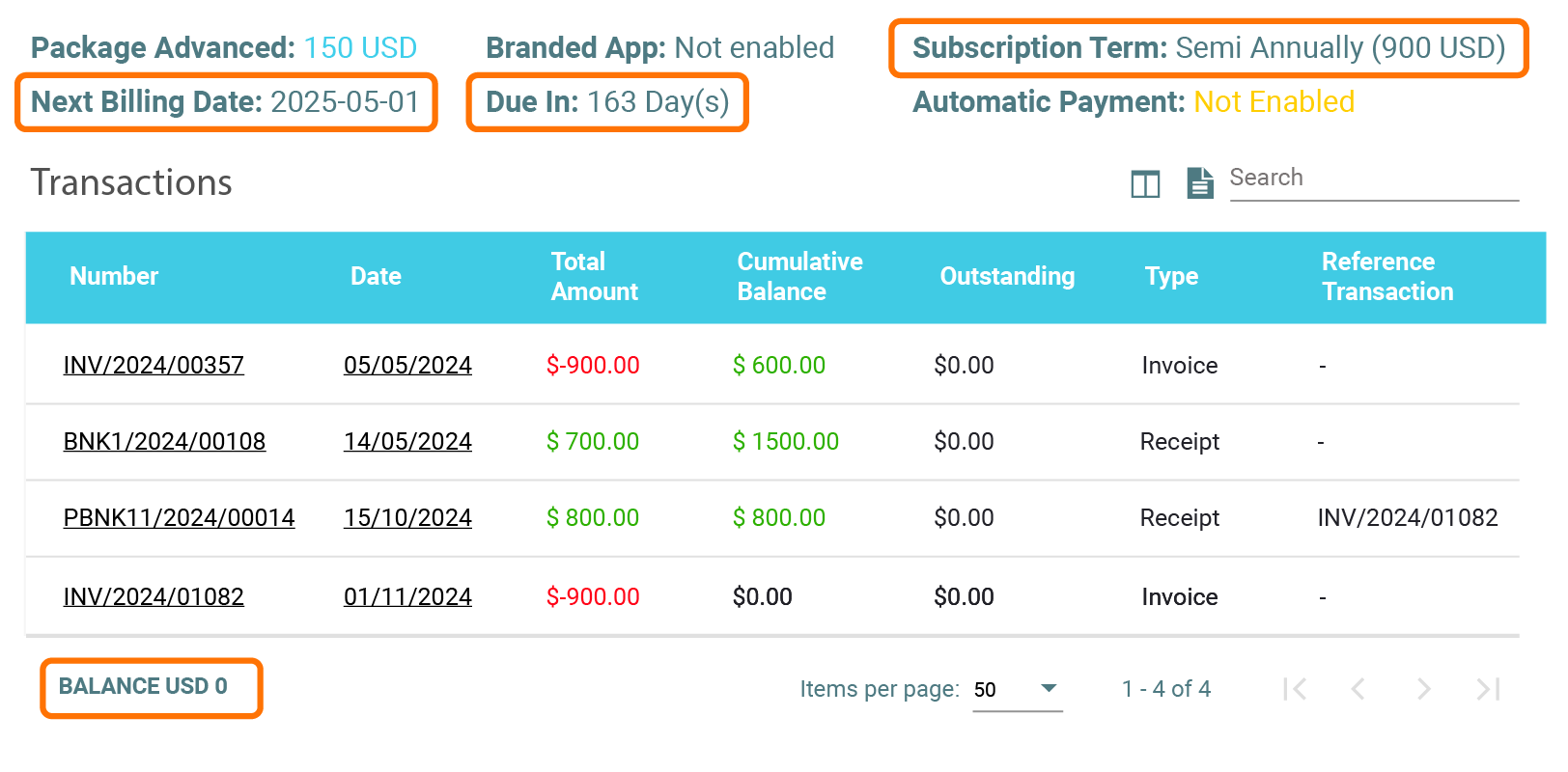 Businesses can view their transaction history, subscription fee and type, and add ons. In addition, they are also able to display details such as their statement of account; including all paid amount, coverage period, and the next payment due date.
