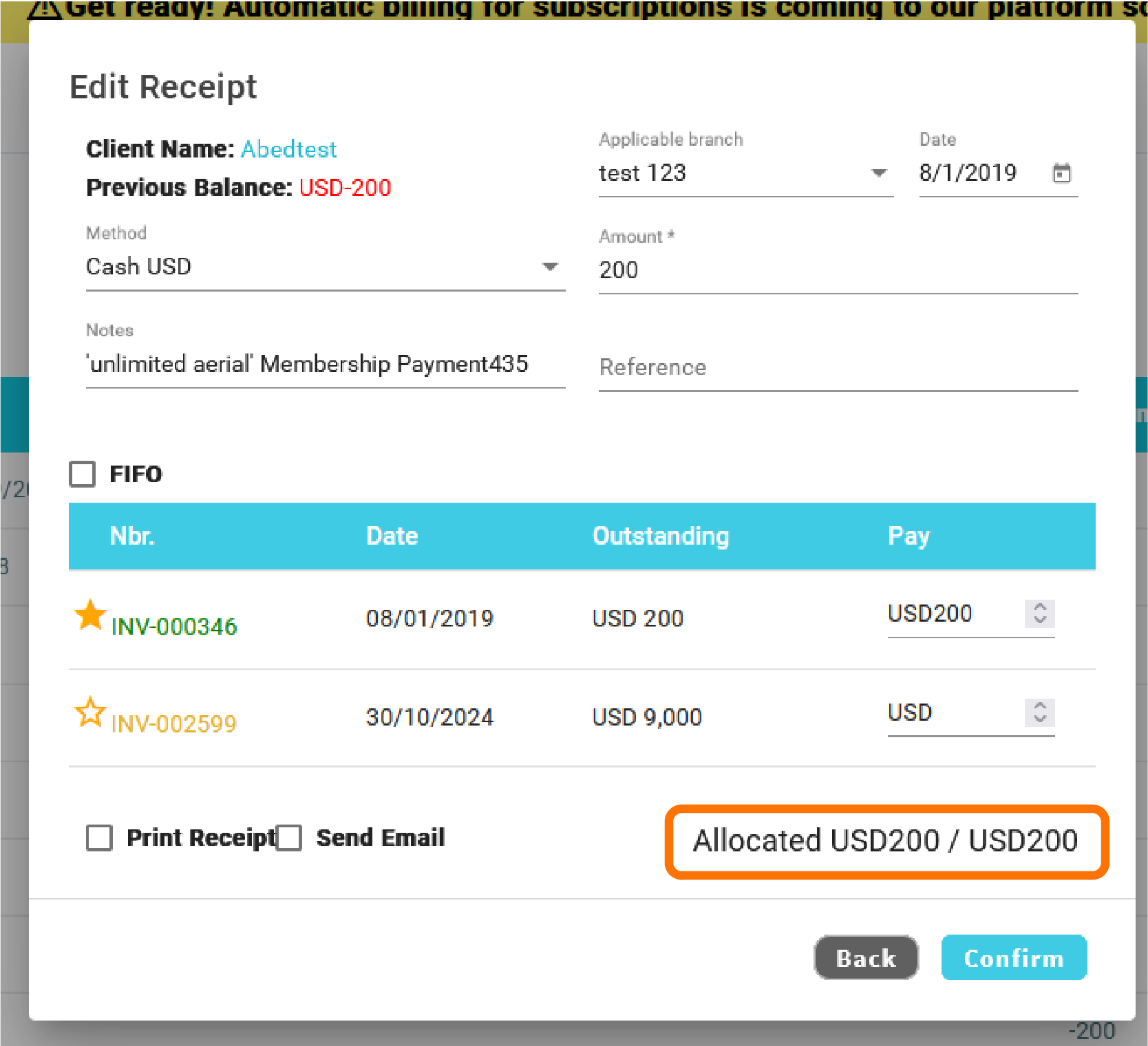 If the client paid online, the receipt is automatically allocated
