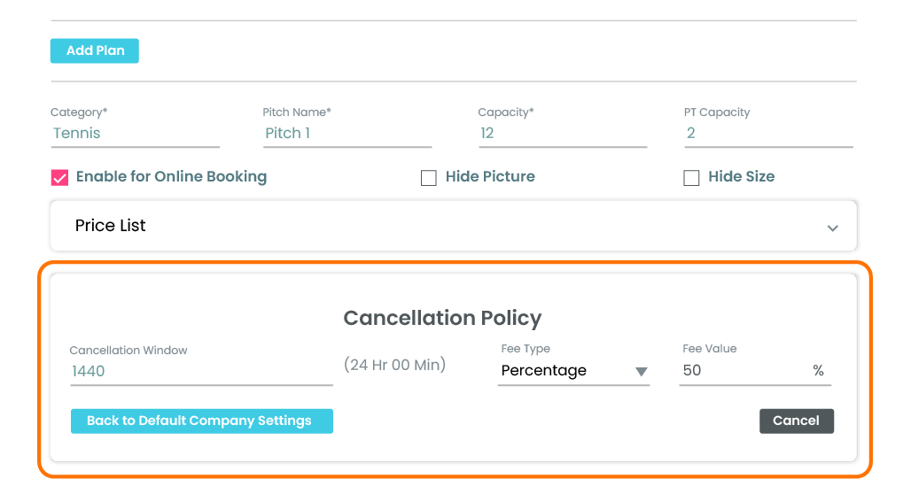 Manage Courts: Configure specific cancellation policies for individual field plans directly within the court management section.