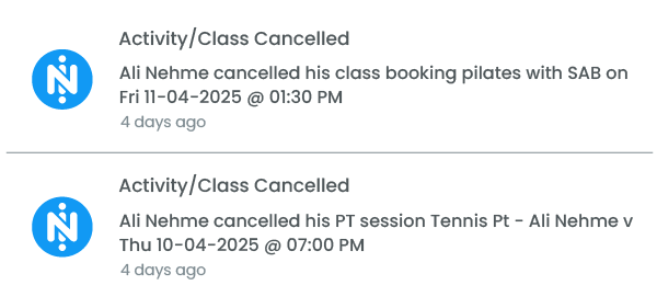 Notifications whenever a Client Cancels a PT Session or a Class